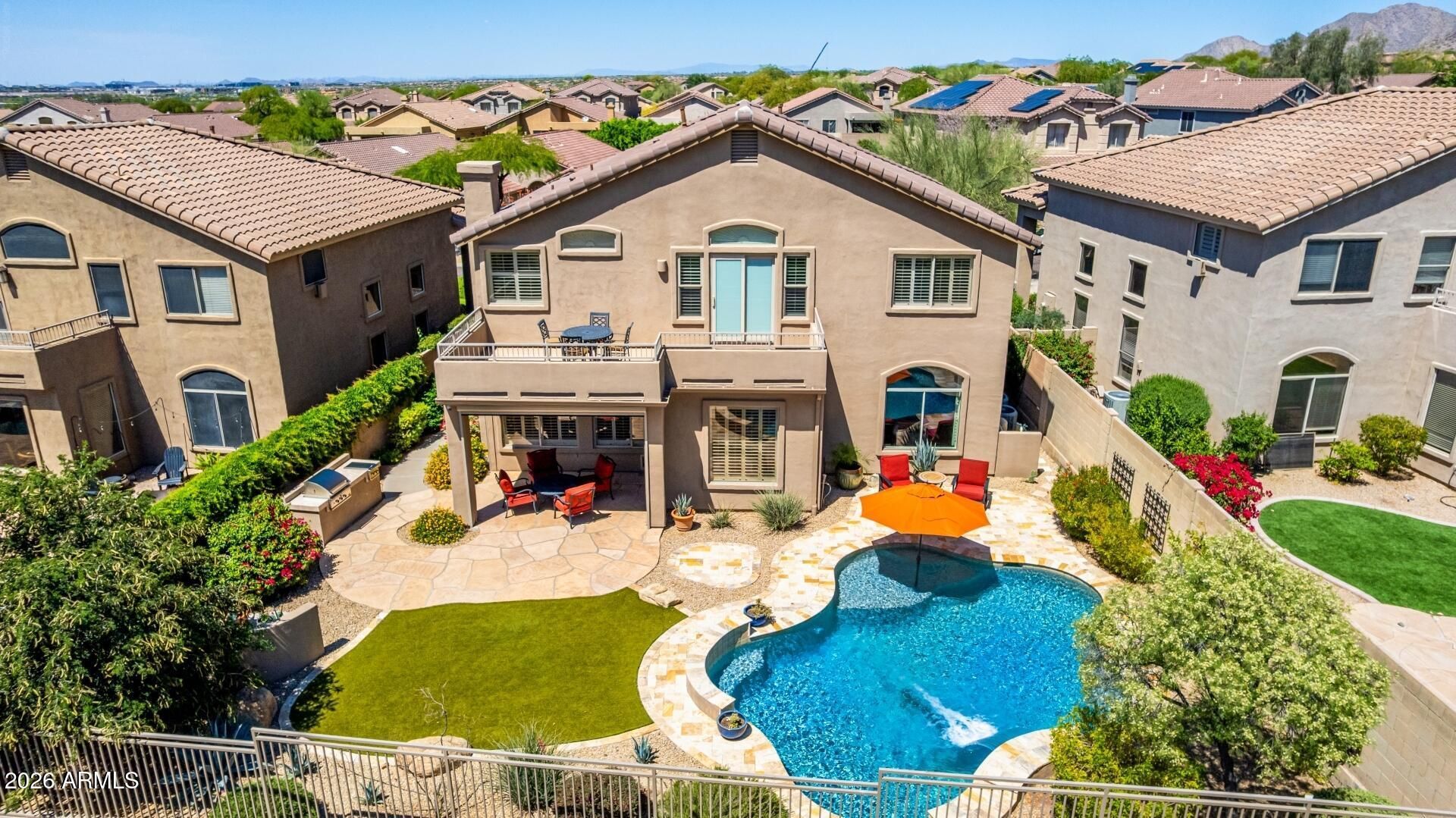 Stunning McDowell Mountain home backing to natural open spaces with mountain and sweeping valley views. This immaculately cared for 4 bed, 3 bath home features a rare 3 car garage, a beautifully remodeled kitchen with new high quality shaker cabinets, quartz counters, induction cooktop, and modern LG/Bosch appliances. Wide plank engineered white oak flooring throughout the main level. Enjoy resort style living with a PebbleTec pool with a waterfall feature, view fence showcasing open natural desert, outdoor high end BBQ island, lush desert landscaping, motorized patio shades, and a view deck overlooking the McDowells and Camelback. Major updates include a new top end roof underlayment (2023) and newer AC units. Located steps from community amenities and local shopping, dining, and more.