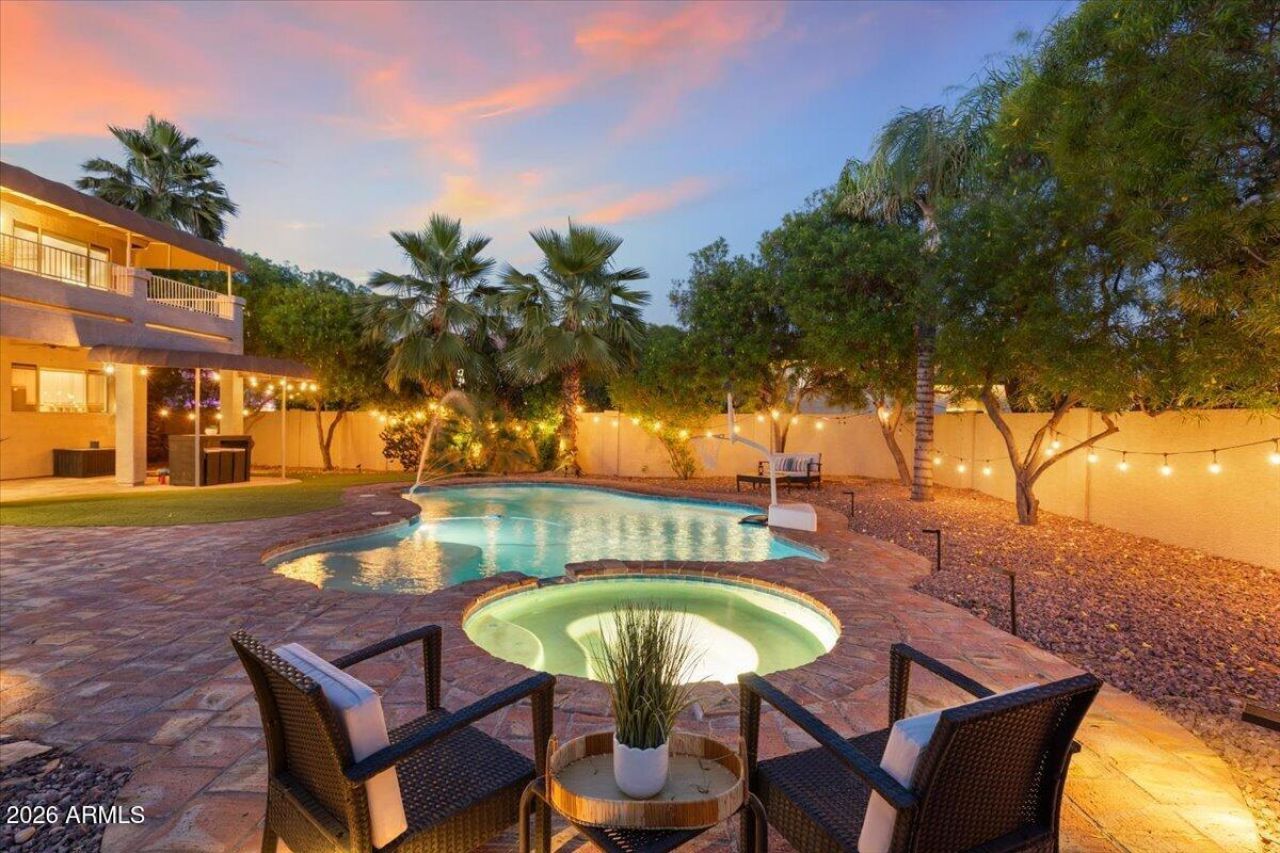 Introducing a rare opportunity to own a distinguished estate in the exclusive, gated enclave of Bel Fleur in Litchfield Park--where timeless design meets resort-style living. This expansive 5-bedroom, 3.5-bath residence is thoughtfully designed to offer both grand-scale entertaining and intimate everyday comfort. A private main-level en-suite provides ideal accommodations for guests or multi-generational living, while a refined office/den creates a quiet space for work or retreat. Throughout the home, three statement fireplaces add warmth and architectural elegance, including a dramatic two-sided fireplace anchoring the luxurious primary suite. This private sanctuary is further enhanced by dual walk-in closets and a serene ambiance designed for relaxation. The homes living spaces are both impressive and inviting--featuring a sunken formal living room, an oversized dining space for memorable gatherings, and a sophisticated family room with a custom bar. An expansive game room offers endless possibilities for recreation, from billiards to a private theater experience.Positioned on a premium corner lot with ideal north/south exposure, the outdoor setting rivals that of a private resort. The backyard is a secluded oasis, showcasing an oversized heated pool and spa with color-changing illumination, a built-in BBQ, fire feature for evening gatherings, and a private putting green--all framed by lush landscaping and curated lighting that transforms the space after sunset. At the heart of the home, the chefs kitchen is equipped with double ovens, a gas cooktop, and generous prep and serving areas--perfectly suited for elevated entertaining. Additional appointments include a whole-home water softener and reverse osmosis system. A full-length covered balcony stretches across the rear elevation, offering a seamless indoor-outdoor lifestyle and elevated views of the tranquil grounds below. With its impressive scale, architectural character, and exceptional outdoor experience, this residence presents a rare canvas to create a truly bespoke luxury estate in one of the West Valleys most coveted gated communities.