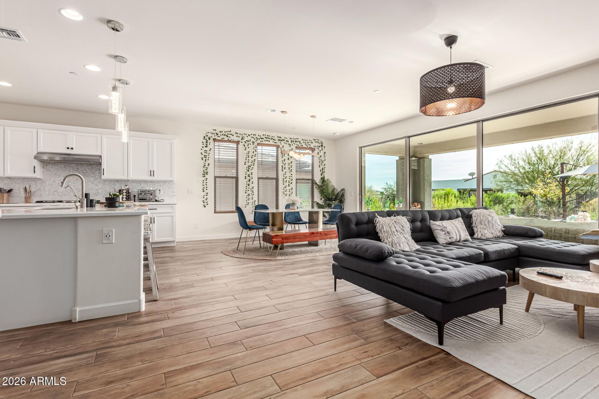 Welcome to your dream home with stunning Four Peaks Views at Trilogy at Verde River--a beautifully upgraded Acacia residence showcasing timeless curb appeal with a two-car garage, elegant paver drive, new fencing, and manicured artificial turf. Inside, the airy Great Room is filled with natural light featuring a designer palette, a custom feature wall, and upgraded wood-look flooring. Designed for both entertaining and everyday comfort, the chefs kitchen features quartz countertops, a reverse-osmosis system, white shaker cabinetry with crown molding, designer tile backsplash, pendant and recessed lighting, stainless steel appliances, a custom walk-in pantry, and an oversized island with breakfast bar seating. A versatile den is ideal for a home office or study. The spacious primary suite offers a spa-inspired bath with dual vanities and a walk-in closet. Outdoors, enjoy a covered patio and ramada, a renovated built-in BBQ, and captivating Four Peaks views. Additional upgrades include a water softener, automatic irrigation front and back and custom landscaping.