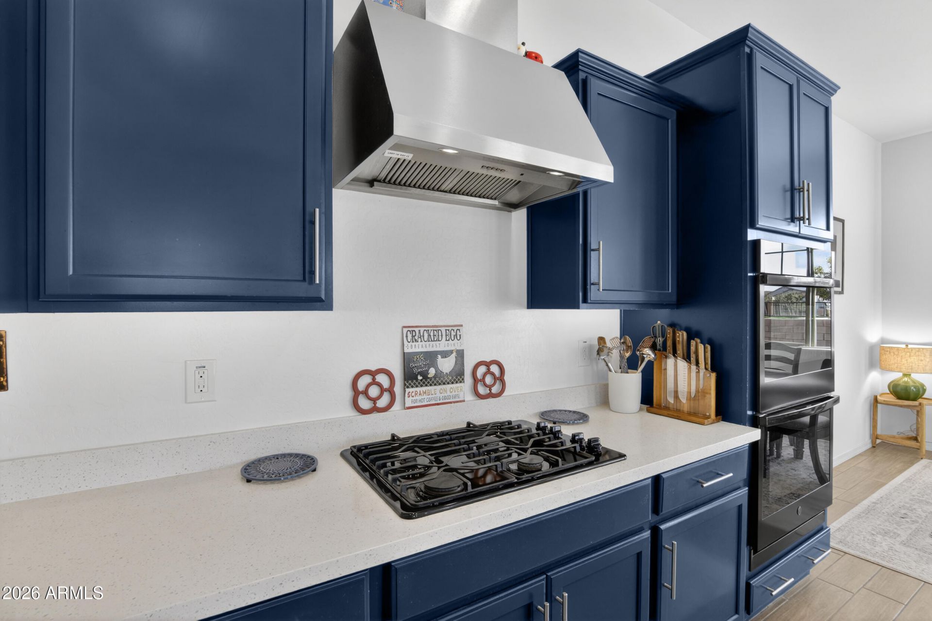 Why wait for new construction? Experience resort-style living in this stunning 4-bedroom, 2-bath home nestled on a premium lot at the end of a quiet cul-de-sac! Bordering a peaceful common area, in the sought-after Legado community, this home combines modern comfort with exceptional neighborhood amenities. Spanning over 2,400sqftt, the open-concept floor plan features elegant wood-look tile throughout the main living areas. The gourmet kitchen impresses with quartz countertops, a large island, sleek black appliances, double wall ovens, a gas cooktop, and an oversized walk-in pantry. Just off the kitchen and dining area, a dramatic 5-panel corner atrium sliding glass door opens from both sides, creating a seamless indoor-outdoor living experience complete with automatic sunshades. The split floor plan offers privacy, with the primary suite showcasing a spa-like bath featuring cultured marble finishes, a separate soaking tub and shower with a rain shower head, and a spacious walk-in closet. Both bathrooms are beautifully appointed and designed for comfort. The backyard is easy to maintain, with a large turf area perfect for entertaining or relaxing year-round.Residents of Legado enjoy access to 20 acres of open space, a clubhouse, resort-style pool and splash pad, a catch-and-release fishing lake with fountain, multiple playgrounds, pickleball, basketball and volleyball courts, community gardens, and scenic walking trails. Conveniently located near Mansel Carter Oasis Park, excellent schools, and Queen Creeks best shopping, dining, and entertainment this home truly has it all.