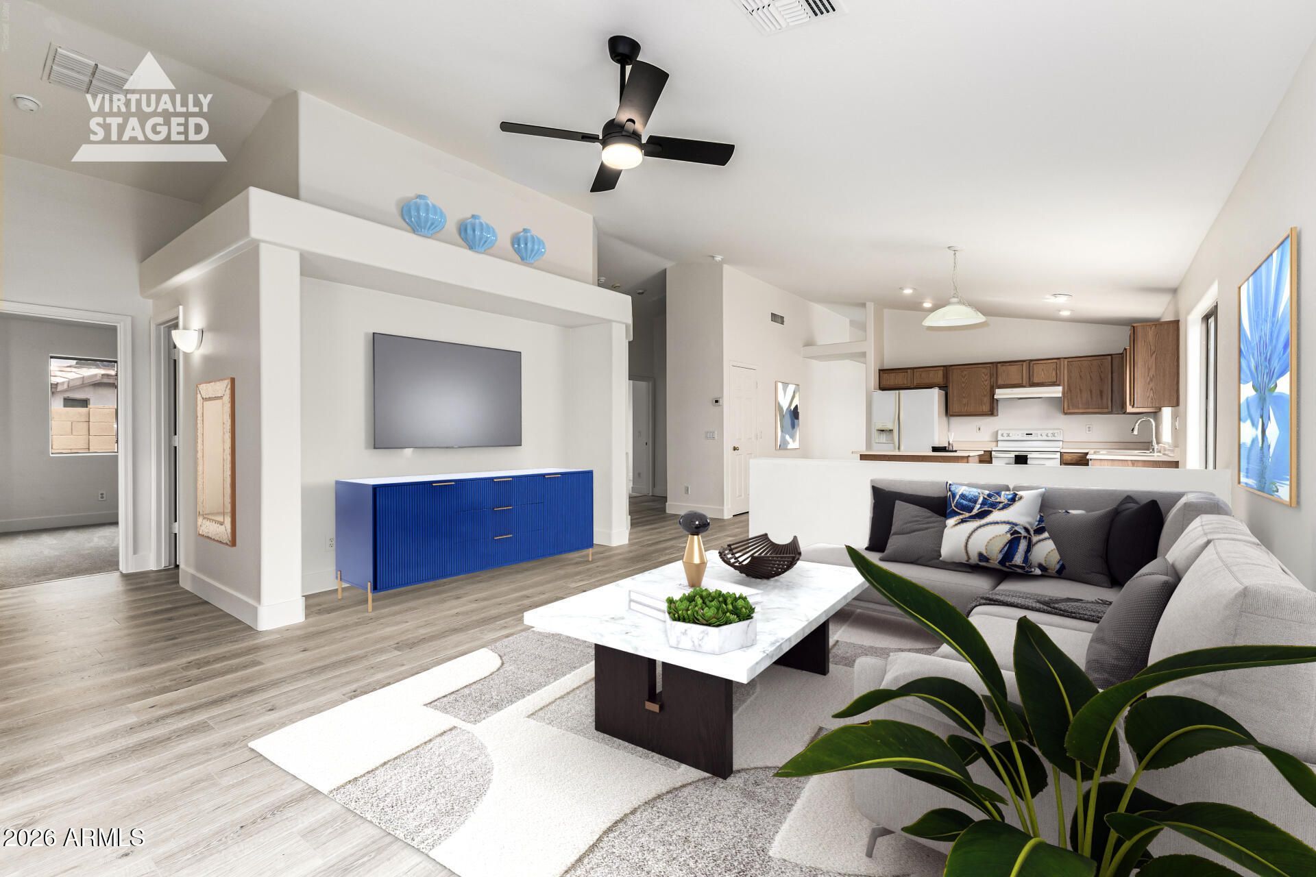 Rare, 1-level home in popular Dreaming Summit! New exterior & interior paint, New modern wood-laminate/carpet thru-out the house, New 5.25 baseboards, New Guest Bath vanity, New plumbing fixtures, and more! Fresh & move-in ready! OneGuard Top Deluxe Home Warranty transferable to Buyer at $0 cost. No neighboring homes behind! Spacious floorplan w/2 entertainment/family areas & 2 dining areas! Kitchen open to the Family Rm with all appliances includes fridge, island w/seating & pantry. Primary Suite is split to the back wing, offering vaulted ceiling, full private Bath w/2 sinks, separate soaking tub & shower + walk-in closet. 3 generous-sized Spare Bedrooms & a dual-entry Guest Bath, & 2 Car Garage round out this sought-after floorplan. Large pool-sized backyard features a covered patio -Wonderful neighborhood to reside in, as well as good investment being a smaller, less expensive home in a neighborhood where majority of the homes are larger and more expensive.- 1 block to enormous community park with soccer fields, ramadas and playground. -4 more lush community parks minutes away offering lovely meandering walking paths-Favorably-rated K-8 elementary school within neighborhood and only 3 mins from your new home-Brand new High School being built and opening in fall 2026 within a couple miles on Litchfield Road. See info here: hilltop.aguafria.org/-1.5 miles to new shopping hub-12 mins to 101 Freeway and 14 mins to Glendale Sports and Entertainment District