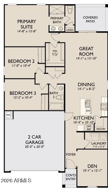 The contemporary Jasmine floor plan offers 1,490 square feet of bright, modern living with 3 bedrooms, 2 baths, a den, and a 2-car garage. Set on a desirable corner lot, this home features a spacious great room that flows easily into the kitchen and dining area, creating an open and inviting feel. The kitchen is both stylish and functional with white cabinetry, playful white subway tile, quartz countertops, GE appliances, and a generously sized pantry. The den adds flexibility for a home office, hobby room, or quiet retreat, while the overall design balances clean lines, comfort, and everyday livability.